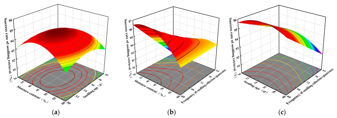 Рисунок 18. Анализ поверхности отклика успешности извлечения рассады. (a) Влияние содержания воды и возраста рассады на успешность извлечения; (b) Влияние содержания воды и частоты извлечения рассады на успешность извлечения; (c) Влияние возраста рассады и частоты извлечения рассады на успешность извлечения.