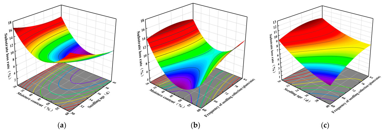 Рисунок 19. Анализ поверхности отклика скорости потери субстрата. (a) Влияние содержания воды и возраста рассады на скорость потери субстрата; (b) Влияние содержания воды и частоты извлечения рассады на скорость потери субстрата; (c) Влияние возраста рассады и частоты извлечения рассады на скорость потери субстрата.