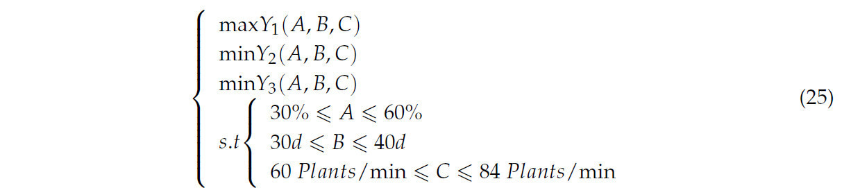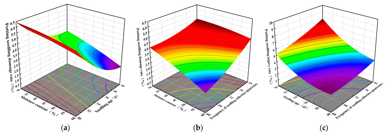 Как показано на Рисунке 20а, при частоте извлечения 72 растения/мин скорость повреждения рассады уменьшается с увеличением возраста рассады при любом заданном уровне содержания влаги, со значительным изменением амплитуды. Когда возраст рассады минимален, скорость повреждения показывает минимальную реакцию на различные содержания влаги и находится на более высокой стадии повреждения. Однако при более старом возрасте рассады скорость повреждения уменьшается с увеличением содержания влаги, хотя тенденция более постепенная, что указывает на то, что возраст рассады оказывает более значительное влияние на скорость повреждения рассады, чем содержание влаги. В возрасте рассады 40 дней и содержании влаги 60% скорость повреждения рассады минимизирована до 2,38%. Это связано с тем, что у более старой рассады стебли толще и прямее, что облегчает захват стебля во время извлечения, таким образом уменьшая повреждение. Как показано на Рисунке 20b, в возрасте рассады 35 дней, когда частота извлечения низкая, скорость повреждения рассады уменьшается с увеличением содержания влаги с большим изменением амплитуды. Когда частота извлечения превышает 72 растения/мин, скорость повреждения рассады не показывает значительного изменения с изменением содержания влаги. При низком содержании влаги скорость повреждения рассады не показывает значительного изменения с изменением частоты извлечения, но при более высоком содержании влаги скорость повреждения увеличивается с увеличением частоты извлечения. При содержании влаги 60% и частоте извлечения 60 растений/мин скорость повреждения рассады достигает самой низкой точки 1,39%. Это связано с взаимодействием между содержанием влаги и частотой извлечения, что приводит к минимальной скорости повреждения рассады. Как показано на Рисунке 20c, при содержания влаги 45%, скорость повреждения рассады уменьшается с увеличением возраста рассады при любой заданной частоте извлечения. Однако при более высоких частотах извлечения амплитуда изменения скорости повреждения более заметна по сравнению с более низкими частотами извлечения. В возрасте рассады 30 дней скорость повреждения рассады значительно увеличивается с увеличением частоты извлечения, в то время как в возрасте 40 дней скорость повреждения увеличивается медленно с более высокой частотой извлечения. В возрасте рассады 30 дней и частоте извлечения 84 растения/мин скорость повреждения рассады самая высокая, 7,78%. Это связано с тем, что стебли более молодой рассады более хрупкие и склонны к изгибу, и с более высокой частотой извлечения скорость машины увеличивается. Во время процесса захвата нисходящее движение концевого эффектора может привести к поломке стебля растения, приводя к увеличению скорости повреждения рассады.