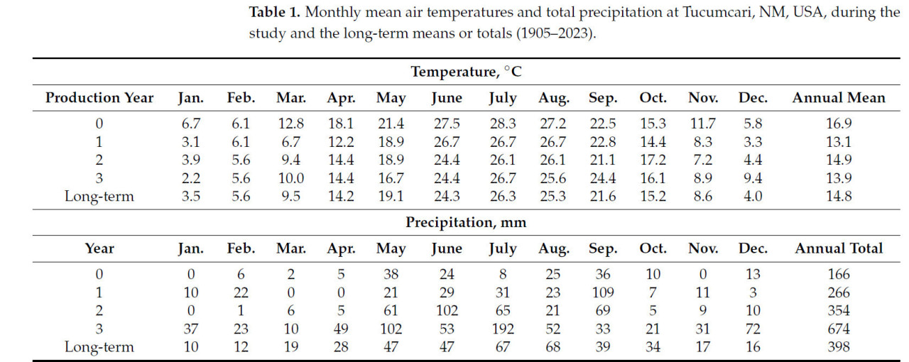 Исследование проводилось в течение двух лет (годы 2 и 3) на поле люцерны (Medicago sativa) после первого производственного года (год 1) в Сельскохозяйственном научном центре Рекса Э. Киркси при Университете штата Нью-Мексико в Тукумкари, Нью-Мексико, США (35°12′0.5″ с.ш., 103°41′12.0″ з.д.; высота 1247 м над ур. м.). Почва представляла собой мелкосуглинистый супесчаный суглинок Canez (fine-loamy, mixed, thermic Ustollic Haplargid). Климат региона по классификации Кеппена-Гейгера — холодный полузасушливый (BSk; http://www.cec.org/north-americanenvironmental-atlas/climate-zones-of-north-america/, дата обращения: 22 мая 2023 г.), характеризуется прохладными, сухими зимами и теплым, влажным летом. Примерно 83% осадков выпадает в виде перемежающихся, относительно интенсивных ливней с апреля по октябрь. Данные о погоде собирались с кооперативной станции Национальной службы погоды, расположенной в пределах 1 км от исследуемой территории (Таблица 1).