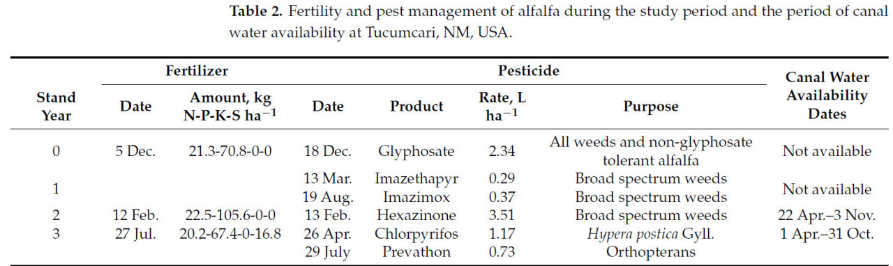 Таблица 2. Внесение удобрений и борьба с вредителями люцерны в период исследования и период доступности канальной воды в Тукумкари, Нью-Мексико, США.