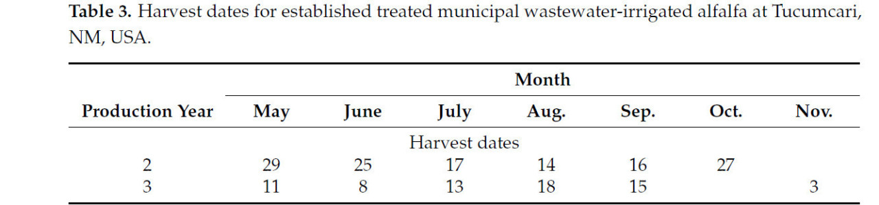 Таблица 3. Даты сбора урожая люцерны, орошаемой очищенными муниципальными сточными водами, в городе Тукумкари, штат Нью-Мексико, США.