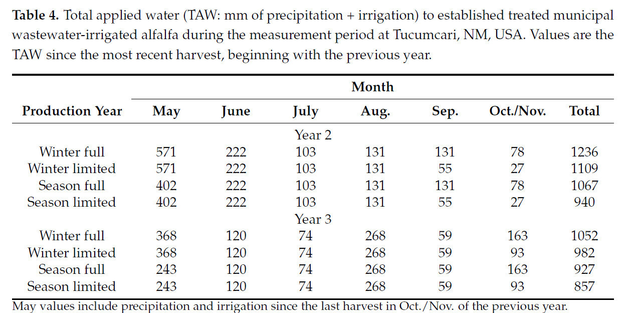 Таблица 4. Общая внесенная вода (TAW: мм осадков + орошения) для устоявшейся люцерны, орошаемой очищенными муниципальными сточными водами, в период измерений в Тукумкари, Нью-Мексико, США. Значения представляют собой TAW с момента последнего сбора урожая, начиная с предыдущего года.