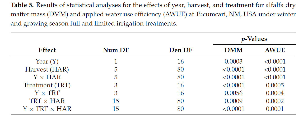 Таблица 5. Результаты статистического анализа влияния года, урожая и обработки на массу сухого вещества люцерны (МСМ) и эффективность использования воды (УОП) в Тукумкари, штат Нью-Мексико, США, при полном и ограниченном поливе в зимний и вегетационный периоды.