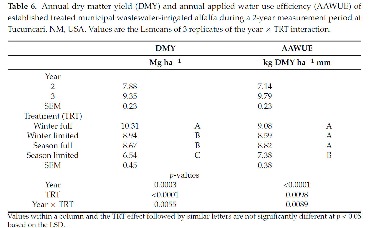 Таблица 6. Годовая урожайность сухой массы (DMY) и годовая эффективность использования воды (AAWUE) укоренившейся люцерны, орошаемой очищенными муниципальными сточными водами, за 2-летний период измерений в Тукумкари, штат Нью-Мексико, США. Значения представляют собой средние значения (Lsmeans) 3 повторений взаимодействия «год × TRT».