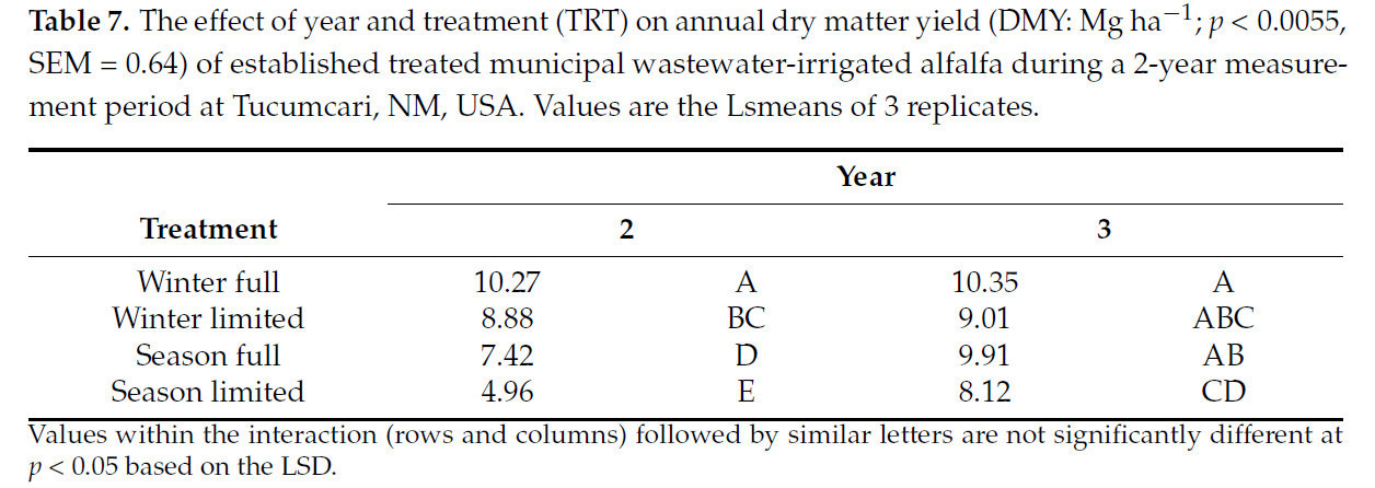 Таблица 7. Влияние года и обработки (TRT) на годовую урожайность сухого вещества (DMY: Мг на га; p < 0,0055, SEM = 0,64) устоявшейся люцерны, орошаемой очищенными муниципальными сточными водами, в течение 2-летнего периода измерений в Тукумкари, Нью-Мексико, США. Значения представляют собой Lsmeans 3 повторений.