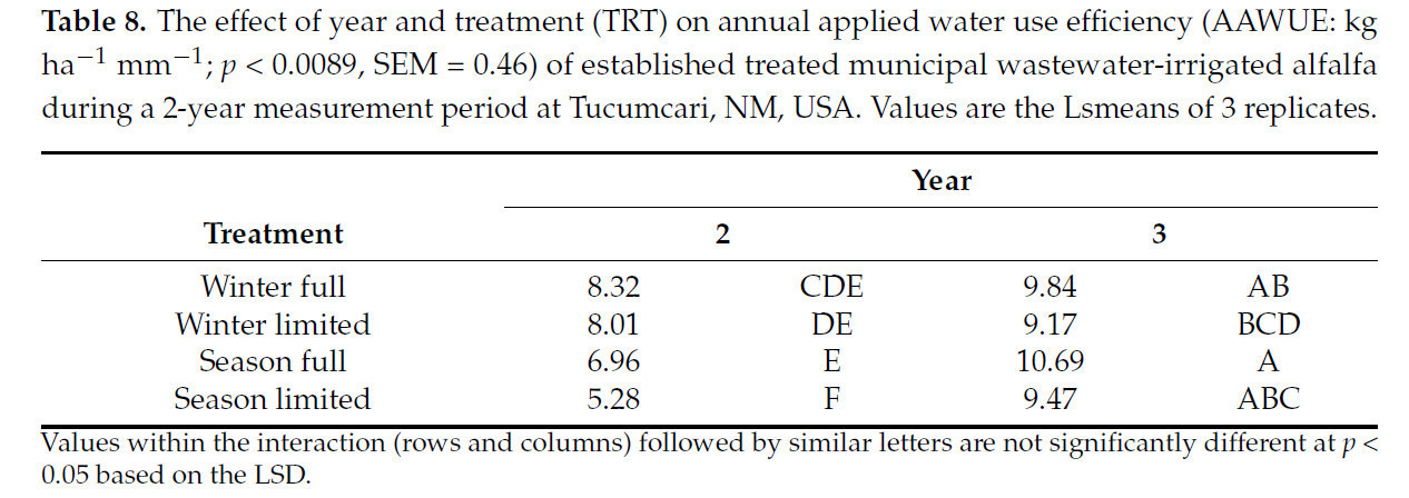 Таблица 8. Влияние года и обработки (TRT) на годовую эффективность использования поливной воды (AAWUE: кг на га на мм; p < 0,0089, SEM = 0,46) устоявшейся люцерны, орошаемой очищенными муниципальными сточными водами, в течение 2-летнего периода измерений в Тукумкари, Нью-Мексико, США. Значения представляют собой Lsmeans 3 повторений.