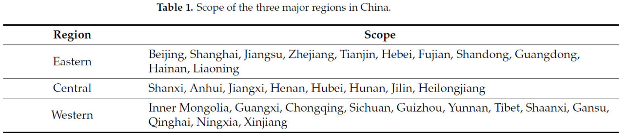 Данные, использованные в этом исследовании, охватывают период с 2008 по 2022 год, то есть 15 лет. В связи со значительными различиями в политическом, статистическом и нормативном контексте между Тайванем, Гонконгом, Макао и материковым Китаем, которые могут повлиять на точность и сопоставимость результатов, эти регионы исключены из данного исследования. Методы отбора и обработки данных в этом исследовании направлены на обеспечение надежности и практической применимости результатов. Для поддержания согласованности и сопоставимости регионального анализа в данном исследовании используется стандарт региональной классификации, установленный Национальным статистическим бюро Китая. Согласно этому стандарту, Китай разделен на три региона — восточный, центральный и западный — на основе географических, экономических и социальных факторов, как показано в таблице 1 .