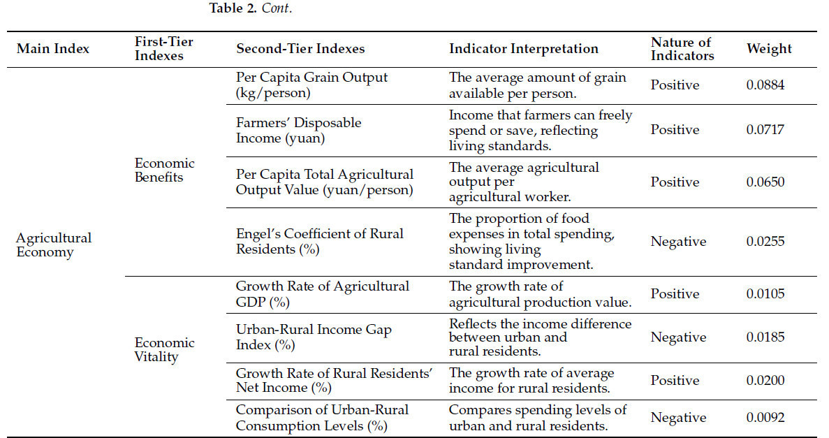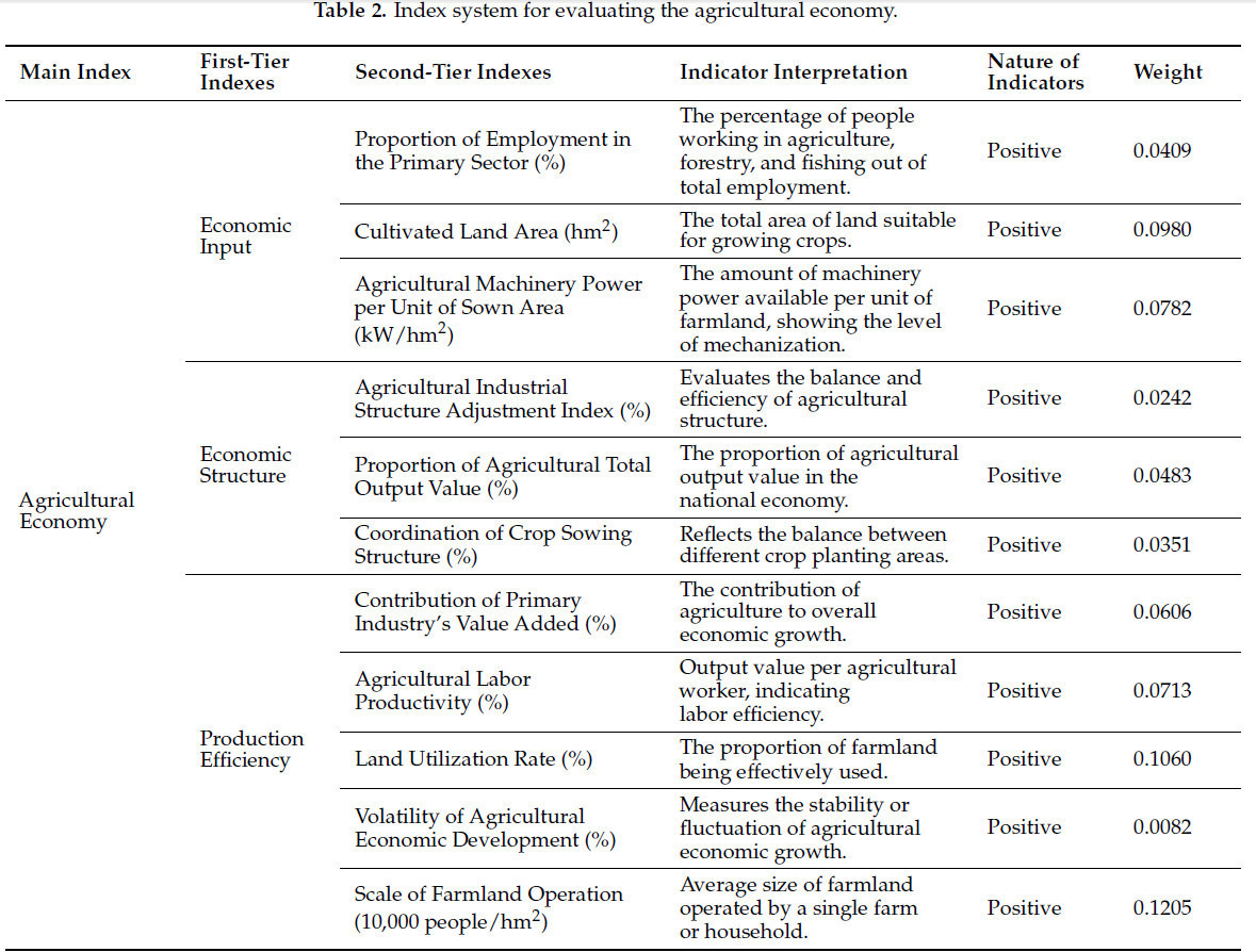 Сельскохозяйственная экономика относится к экономической системе, сформированной вокруг сельскохозяйственного производства, обращения, потребления и связанных с ними видов деятельности, являясь неотъемлемой частью национальной экономики [ 41 ]. С развитием современного сельского хозяйства сельскохозяйственная экономическая система становится все более сложной и разнообразной. Один показатель не может всесторонне измерить уровень ее многомерного и комплексного развития. Поэтому построение многоуровневой и многомерной системы оценочных показателей имеет важное значение для научной оценки развития сельскохозяйственной экономической системы. В данном исследовании используются результаты работ Лю и др. (2020) [ 24 ], Чжан и др. (2023) [ 26 ], Чен и др. (2023) [ 27 ], Гао (2023) [ 28 ], Го и др. (2024) [ 42 ], Ван и др. (2024) [ 43 ], Го и др. (2023) [ 44 ], Лю и др. (2022) [ 45 ] и Сунь и др. (2022) [ 25 ]. На основе этих исследований было выбрано 19 показателей из пяти измерений: экономические затраты, экономическая структура, эффективность производства, экономические выгоды и экономическая деятельность, для построения системы оценочных показателей для сельскохозяйственной экономической системы.