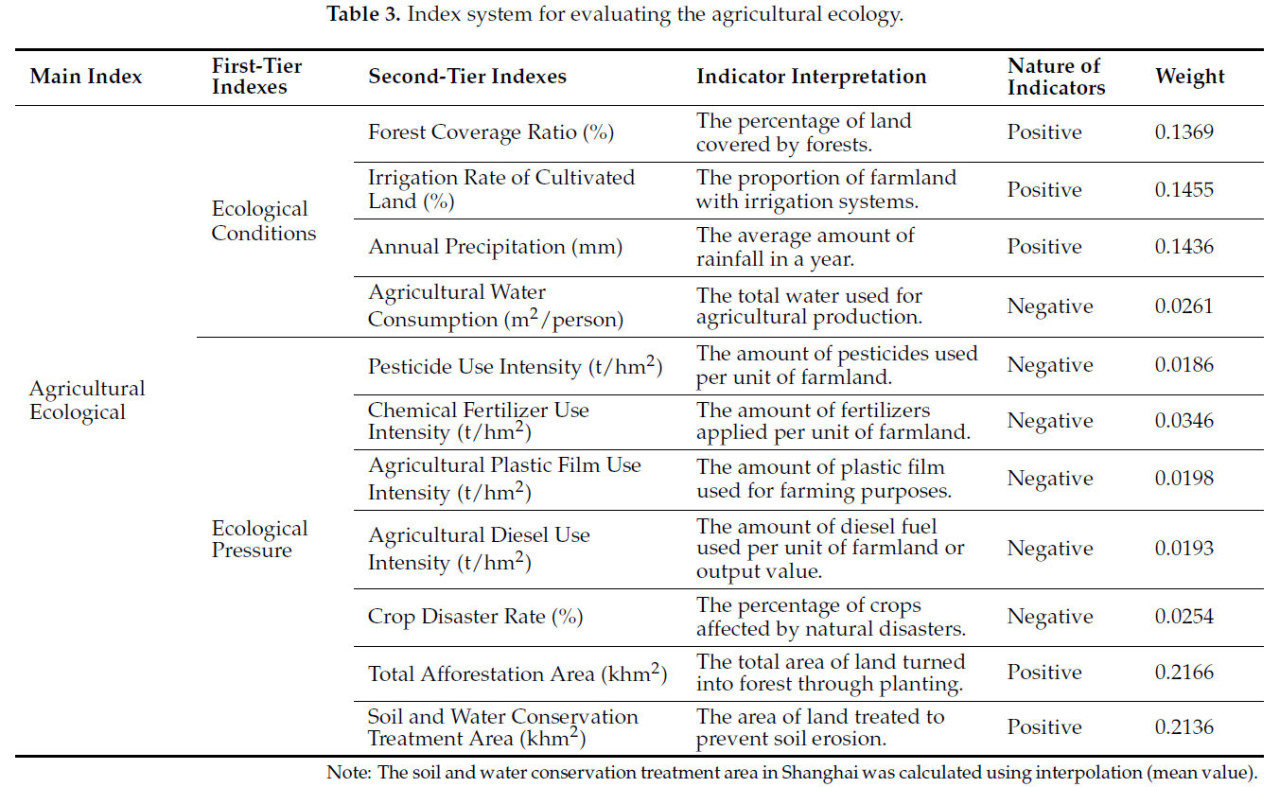 Сельскохозяйственная экология относится к системе, сформированной взаимодействием сельскохозяйственного производства и экологической среды, включая экологические условия, экосистемные услуги и воздействие сельскохозяйственной деятельности на окружающую среду. Она служит важнейшей основой для устойчивого развития сельского хозяйства и экологического баланса. С развитием современного сельского хозяйства сельскохозяйственные экосистемы сталкиваются с растущим экологическим давлением, а также с возрастающими проблемами сложности и стабильности. Для всесторонней оценки уровня их развития необходимо построить многоуровневую, многомерную систему оценочных показателей. В данном исследовании используются результаты исследований Лю и др. (2020) [ 24 ], Хоу и др. (2024) [ 30 ], Цзян и др. (2022) [ 36 ], Лю и др. (2022) [ 45 ] и Ян и др. (2019) [ 46 ]. На основе этих исследований были выбраны 11 показателей из двух измерений: экологические условия и экологическое давление, для построения системы оценочных показателей сельскохозяйственной экологии.