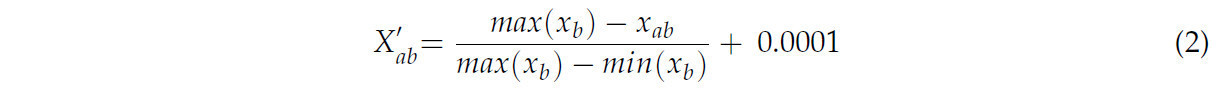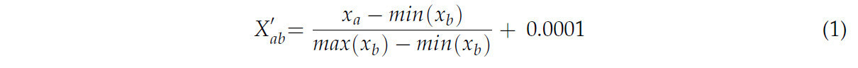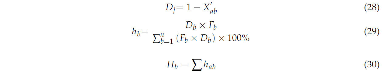Сельскохозяйственная экономика и экосистема включают в себя множество сложных показателей. Из-за различий в объеме данных прямое сравнение затруднительно, требуя научного метода для присвоения весов и обеспечения сопоставимости данных. Метод энтропийного взвешивания, заимствованный из физики, измеряет неупорядоченность системы [ 47 ]. Введенный в анализ решений в 1965 году [ 48 ], он широко применяется в теории информации, экологии и экономике. Количественно оценивая неопределенность показателей, более низкие значения энтропии указывают на более высокую изменчивость и больший вес. Благодаря своей объективности и надежности метод энтропийного взвешивания стал важным инструментом для оценки множества показателей [ 49 ]. Таким образом, в данном исследовании мы используем метод энтропийного взвешивания для расчета весов показателей сельскохозяйственной экономики и экосистемы. Процесс вычислений выглядит следующим образом: