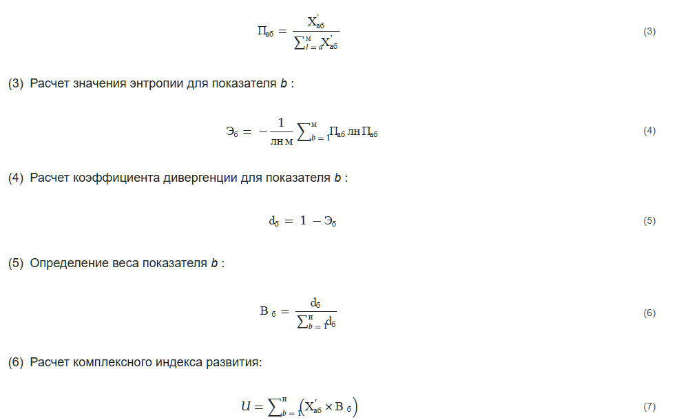 В формулах (1)–(7), X'аб представляет собой стандартизированное значение b -го показателя в году a, и Паб — это доля b -го показателя в году а относительно суммы всех стандартизированных значений. Значение энтропии, Эб измеряет неопределенность b -го индикатора и коэффициент дивергенции. dб отражает его изменчивость. Вес Вб. Значение каждого показателя определяется на основе его коэффициента расхождения. Наконец, комплексный индекс развития U получается путем суммирования взвешенных стандартизированных значений всех показателей.