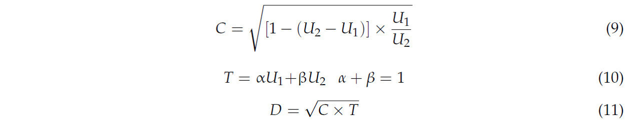Модель координации связей была первоначально разработана в физике для описания взаимодействий и уровней координации между системами [ 50 ]. При применении в социальных науках традиционные модели часто сталкиваются с проблемой недостаточной дифференциации результатов вычислений, что затрудняет точное отражение степени связи истинной координации систем [ 51 ]. Для решения этой проблемы Ван Шуцзя и другие ученые предложили модифицированную модель координации связей. Эта модифицированная модель вводит механизм нелинейной корректировки и динамические веса, повышая ее адаптивность к взаимодействиям внутри сложных систем. Эти улучшения позволяют модели лучше обрабатывать нелинейные связи и динамические изменения между системами, увеличивая дифференциацию результатов вычислений и значительно повышая достоверность степени связи [ 51 ]. Сегодня модифицированная модель координации связей широко применяется в таких областях, как экономика, экология и охрана окружающей среды [ 52 , 53 , 54 ]. В данном исследовании модифицированная модель координации связей используется для анализа уровня координации сельскохозяйственной экономики и развития экосистем с целью повышения точности и надежности результатов анализа. Процесс вычислений выглядит следующим образом: