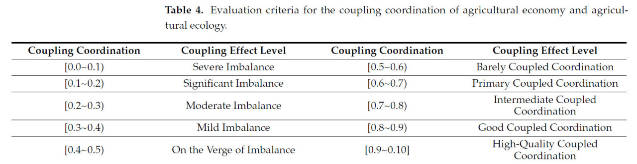 В уравнениях (9)–(11) C представляет собой степень взаимосвязи между сельскохозяйственной экономикой и экологией в диапазоне [0, 1]. T обозначает комплексный индекс координации, а α и β представляют собой веса сельскохозяйственной экономики и экологии соответственно. Учитывая взаимное взаимодействие между ними в процессе развития и принимая во внимание результаты предыдущих исследований, предполагается, что они одинаково важны для скоординированного развития, следовательно, α = β = 0,5 [ 25 , 29 , 46 , 55 , 56 ]. D представляет собой индекс взаимосвязи координации между сельскохозяйственной экономикой и экологией в диапазоне [0, 1]. Более высокое значение D указывает на лучшую взаимосвязь координации между ними. На основе метода деления на равные интервалы [ 57 ] степень взаимосвязи координации между сельскохозяйственной экономикой и экологией классифицируется на 10 уровней ( таблица 4 ).