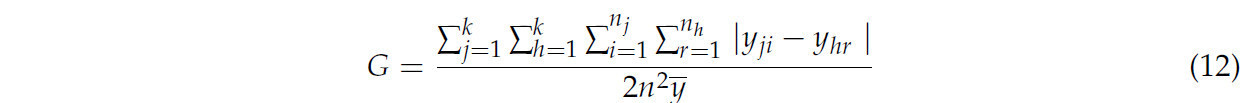 Коэффициент Джини Дагума, предложенный Камило Дагумом в 1980 году, является расширением традиционного коэффициента Джини, предназначенного для лучшего анализа и интерпретации неравенства [ 58 ]. Традиционный коэффициент Джини имеет ограничения в выявлении региональных различий, в частности, в своей неспособности эффективно различать внутрирегиональное и межрегиональное неравенство. Для решения этих проблем коэффициент Джини Дагума разлагает общее неравенство на внутрирегиональное неравенство, межрегиональное неравенство и коэффициент вклада, тем самым преодолевая ограничения традиционной модели [ 58 ]. Это разложение обеспечивает более точное понимание региональных различий, что делает коэффициент Джини Дагума широко применимым в таких областях, как экономика, регионоведение и социальное развитие [ 59 , 60 ]. В данном исследовании коэффициент Джини Дагума используется для измерения региональных различий в сопряженном и скоординированном развитии сельскохозяйственной экономики и экосистем. Он позволяет проводить более глубокий анализ компонентов внутрирегионального и межрегионального неравенства, обеспечивая научную основу для содействия скоординированному региональному развитию. Формула для расчета общего коэффициента Джини выглядит следующим образом: