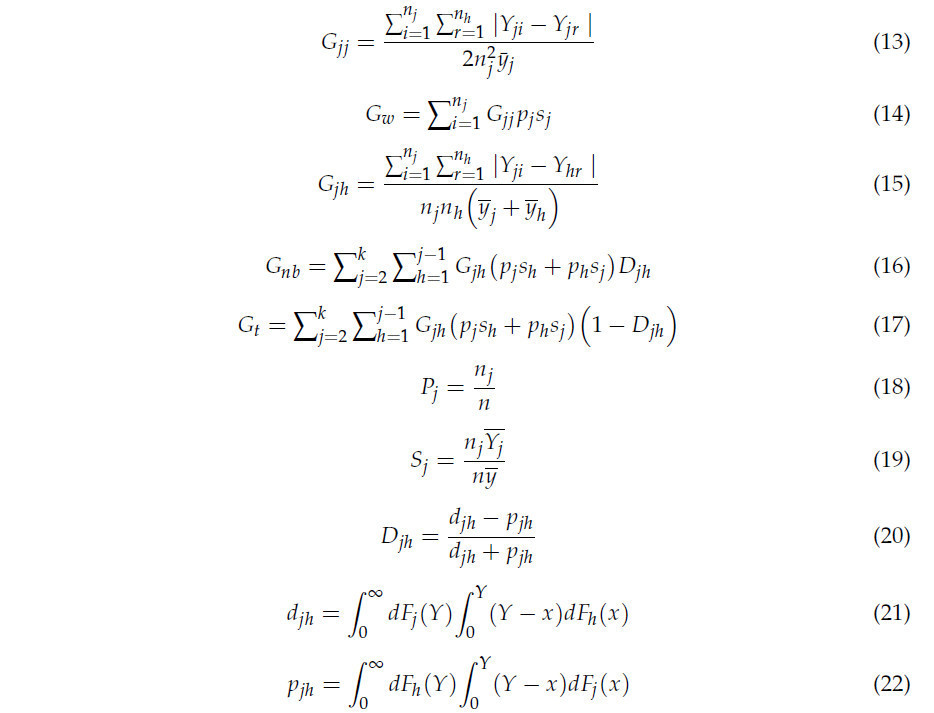 В уравнении (12) G представляет собой коэффициент Джини Дагума. j иℎi и r обозначают различные регионы, а i и r — провинции в пределах этих регионов. k — общее количество регионов, анджин ℎ количество провинций в регионе j и ℎ, соответственно. 𝑌𝑗 𝑖 и 𝑌ℎ 𝑟 являются уровнями координации связей провинций i и r в регионах j и h соответственно, ий̲— это средний уровень координации связей по всем провинциям. В уравнениях (13)–(17) коэффициент Джини разбит на три части: внутрирегиональное неравенство (Гв), межрегиональное неравенство (Гн б), и плотность межрегиональной изменчивости (ГтВ уравнениях (18)–(22) определены несколько ключевых переменных: Пдж — это доля провинций в регионе j .Сдж — это средний уровень координации связи для области j , и Д𝑗 ℎ представляет собой разницу между регионами j и h .d𝑗 ℎ и п𝑗 ℎ используются для расчета различий в уровнях координации связи между регионами.Фджи Фℎ являются кумулятивными функциями распределения уровней координации связи в областях j и h соответственно.