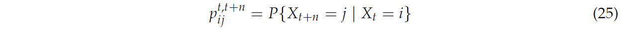 Цепь Маркова отражает распределение вероятностей переходов между различными состояниями координации взаимодействия в Китае во времени. В этой модели состояниеXтв момент времени t зависит исключительно от состояния.X𝑡 − 1на предыдущем шаге по времени. Вероятность перехода.П𝑡 , 𝑡 + 𝑛𝑖 𝑗обозначает вероятность перехода из состояния i в состояние j в период между годами t и t + n , рассчитываемую следующим образом: