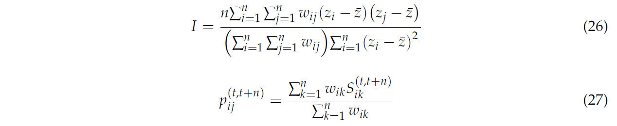 Традиционная цепь Маркова эффективна для выявления закономерностей перехода степеней координации связи во времени, но не учитывает пространственную зависимость и региональные различия. Для решения этой проблемы была разработана пространственная цепь Маркова, включающая пространственную матрицу смежности для учета влияния соседних регионов. Такой подход позволяет анализировать пространственную агломерацию и эффекты передачи, повышая способность модели улавливать региональную эволюцию [ 66 ]. В данном исследовании пространственная цепь Маркова применяется для анализа характеристик пространственного перехода степени координации связи между сельскохозяйственной экономикой и экосистемами в Китае с 2008 по 2022 год. Для изучения того, как координация связи соседних провинций влияет друг на друга, пространственная цепь Маркова сочетается с индексом Морана I для проверки пространственной корреляции [ 67 ]. Формула для индекса Морана I выглядит следующим образом: