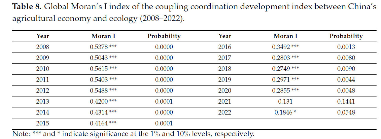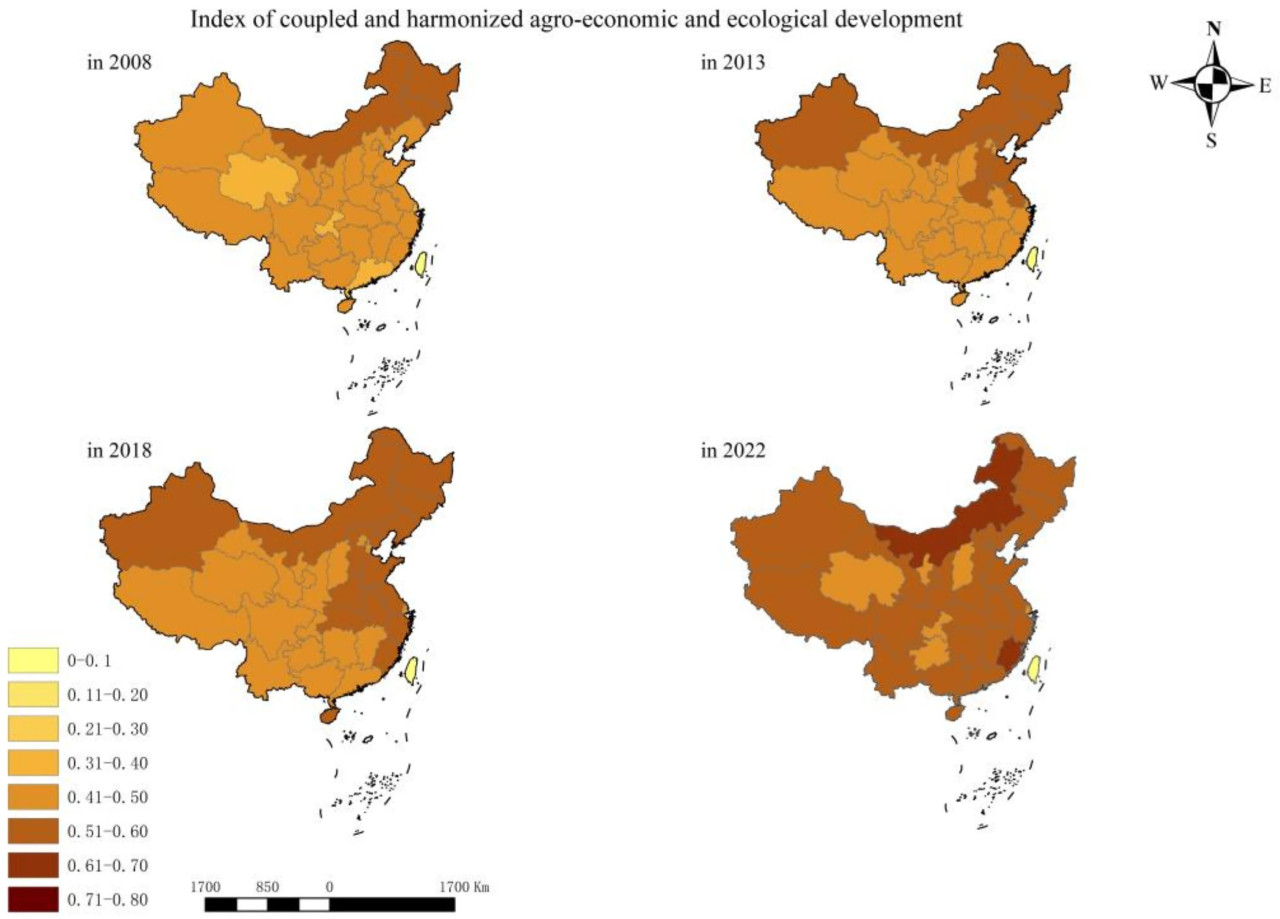 В глобальном масштабе достижение скоординированного развития сельского хозяйства и экосистем имеет решающее значение для решения проблем, связанных с изменением климата, деградацией земель и продовольственной безопасностью [ 1 ]. По данным Продовольственной и сельскохозяйственной организации ООН (ФАО), более 30% мировых сельскохозяйственных земель подвергаются деградации, а изменение климата еще больше усиливает неопределенность в сельскохозяйственном производстве. Будучи одним из крупнейших мировых производителей сельскохозяйственной продукции, Китай играет важную роль в обеспечении продовольственной безопасности, стимулировании экономического роста и поддержании социальной стабильности [ 2 ]. Однако его многолетняя зависимость от высокозатратных и высокопроизводительных моделей производства усилила экологическое давление, что привело к чрезмерной эксплуатации земель, эрозии почвы и сокращению биоразнообразия [ 3 , 4 , 5 , 6 ]. Эти проблемы не только угрожают устойчивости сельского хозяйства, но и усугубляют напряженность между развитием сельского хозяйства и целостностью экосистем. Одновременно с этим, координация сельского хозяйства и экологии в Китае демонстрирует заметные региональные различия. Восточные регионы, поддерживаемые передовыми технологиями и надежной политикой, относительно быстро продвинулись в направлении охраны окружающей среды и модернизации сельского хозяйства, в то время как центральные и западные регионы, ограниченные ресурсами и экономическими основами, сталкиваются с более серьезными проблемами в достижении скоординированного развития [ 7 ]. В ответ на эти вызовы в Центральном документе № 1 правительства Китая от 2024 года подчеркивается необходимость продвижения экологически чистого низкоуглеродного сельскохозяйственного перехода, усиления контроля за неточечным загрязнением и повышения уровня защиты и восстановления экосистем. Эти инициативы направлены на сокращение региональных разрывов и направление сельскохозяйственно-экологической координации на более сбалансированный и устойчивый путь. В этом контексте изучение взаимосвязи и скоординированного развития сельскохозяйственной экономики и экосистем, особенно их региональных различий и пространственно-временной динамики, помогает выявить ключевые ограничения и обеспечивает научную поддержку оптимизации ресурсов и целенаправленного формирования политики. Это имеет решающее значение для продвижения устойчивого сельского хозяйства и охраны окружающей среды в Китае. Исходя из этого, в данном исследовании, используя данные по 31 региону провинциального уровня в Китае за период с 2008 по 2022 год, построена комплексная оценочная модель, и с помощью многофакторных эконометрических методов проведен систематический анализ пространственно-временных характеристик, региональных различий, динамики развития и барьеров на пути скоординированного развития сельскохозяйственной экономики и экосистем.