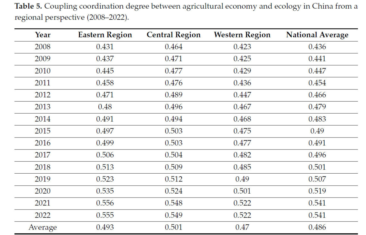 Согласно таблице 5 , результаты исследования можно суммировать в двух основных пунктах: Во-первых, степень координации взаимодействия в трех регионах (восточном, центральном и западном) демонстрировала устойчивое улучшение с течением времени. В течение периода исследования, за исключением небольших колебаний в центральном и западном регионах в 2011 и 2014 годах, во всех регионах наблюдался ежегодный рост, что указывает на прогресс в направлении повышения уровня координации между агроэкономикой и экологией. Многолетние средние значения степени координации взаимодействия были следующими: центральный регион (0,501) > восточный регион (0,493) > западный регион (0,47). Во-вторых, степень координации взаимодействия в восточном регионе увеличилась с 0,431 в 2008 году до 0,555 в 2022 году, с темпом роста 28,77%. С 2011 года она стабильно превышала средний показатель по стране (0,466) и превзошла центральный регион в 2017 году, сохраняя лидерство и в дальнейшем. Это показывает, что восточный регион продемонстрировал наиболее значительный рост среди трех. Центральный регион также показал стабильный рост, увеличившись с 0,464 в 2008 году до 0,549 в 2022 году. На протяжении всего периода исследования степень координации связей в нем оставалась выше среднего показателя по стране, хотя темпы роста были несколько ниже, чем в восточном регионе. В отличие от этого, степень координации связей в западном регионе увеличилась с 0,423 в 2008 году до 0,522 в 2022 году, с темпами роста в 23,4%. Однако она постоянно оставалась ниже среднего показателя по стране и оставалась самой слабой среди трех регионов.