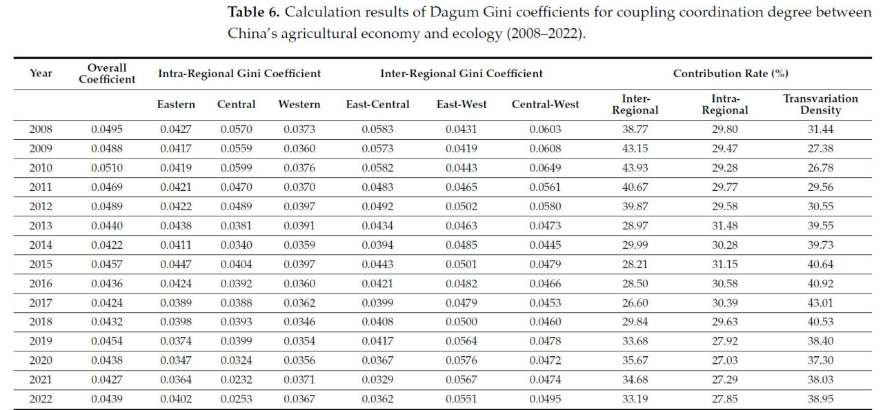 Таблица 6. Результаты расчета коэффициентов Джини Дагума для степени координации взаимосвязи между сельскохозяйственной экономикой и экологией Китая (2008–2022 гг.).