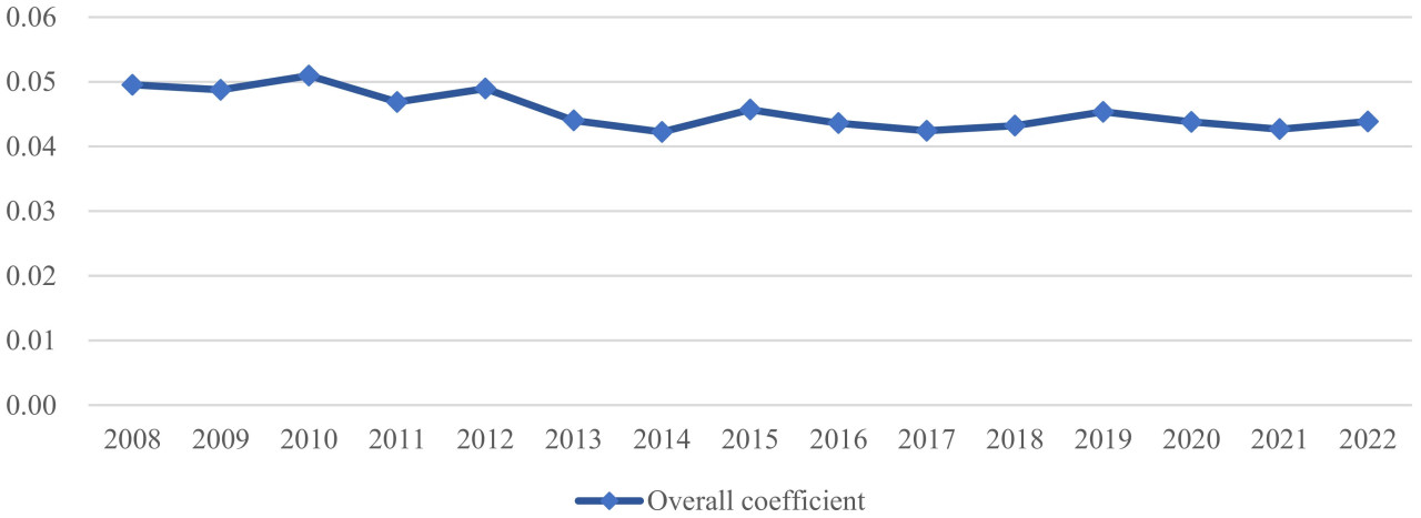 Рисунок 4 , построенный на основе результатов, рассчитанных по данным таблицы 6 , показывает общие различия в степени координации взаимосвязи между сельскохозяйственной экономикой и экологией Китая и их динамику. За исследуемый период общее различие уменьшилось с 0,0495 в 2008 году до 0,0439 в 2022 году, демонстрируя колеблющуюся тенденцию к снижению. Это указывает на постепенное сокращение общих различий в уровнях развития координации. Однако динамические изменения были нестабильными, демонстрируя периодические колебания. Например, общее различие выросло с 0,0495 в 2008 году до 0,051 в 2010 году, упало до 0,0469 в 2011 году, достигло минимума в 0,0422 в 2014 году, а затем колебалось около 0,0437, с двумя дополнительными подъемами и спадами за этот период.