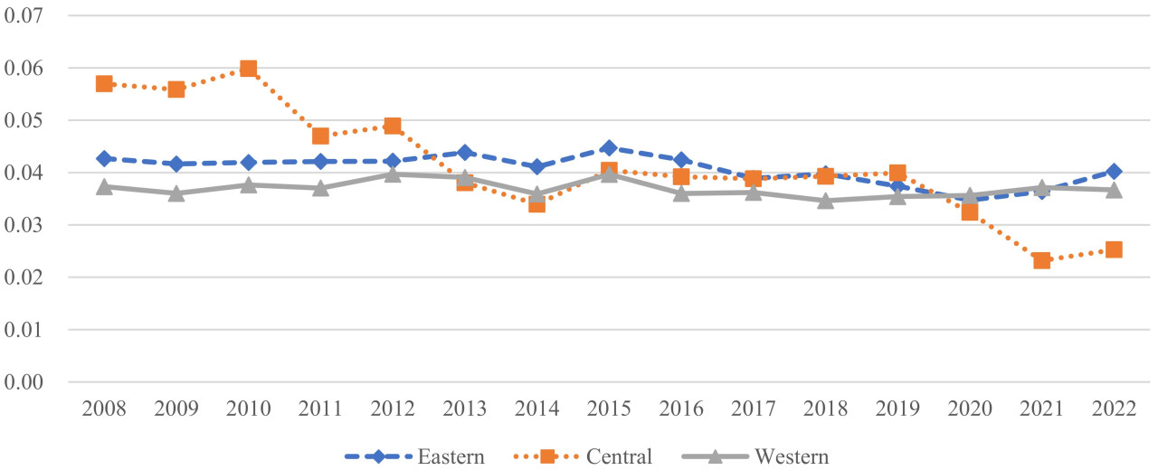 Рисунок 5 был создан с использованием результатов, рассчитанных на основе таблицы 6. На рисунке 5 показаны коэффициенты Джини степени координации связей для трех основных регионов. В целом, коэффициенты Джини снизились, но величина и характер снижения различались по регионам. На основе средних значений региональный рейтинг был следующим: центральный (0,0413) > восточный (0,0407) > западный (0,0369), что указывает на относительно более высокий уровень внутреннего дисбаланса в центральном регионе. В частности, центральный регион показал наибольшее снижение: коэффициент Джини упал с 0,057 в 2008 году до 0,0253 в 2022 году, что составляет снижение на 55,61%. Восточный регион демонстрировал модель «рост-падение-рост», достигнув пика в 0,0447 в 2015 году и самого низкого значения в 0,0347 в 2020 году. Западный регион испытывал меньшие колебания, при этом коэффициент Джини оставался относительно стабильным на уровне около 0,037. В целом, внутренние различия между тремя регионами постепенно уменьшались, что отражает значительный прогресс в содействии координации между аграрной экономикой и экологией, а также частично смягчает дисбаланс в региональном развитии.