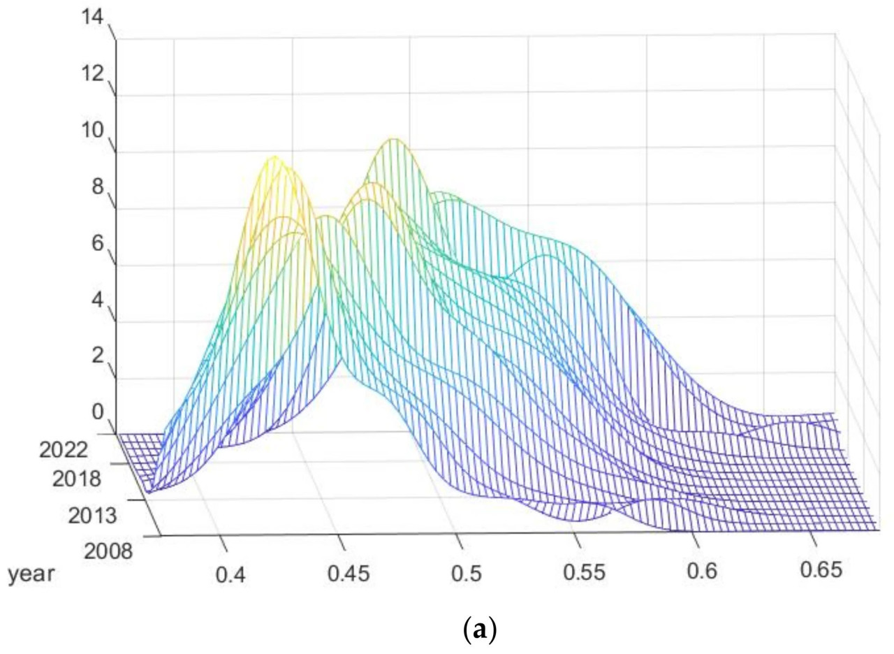 Используя коэффициент Джини Дагума для анализа различий в сельскохозяйственной экономике и экологии Китая, в этом разделе применяется оценка плотности ядра для расчета абсолютных различий и тенденций. Кривые плотности ядра координации связи, построенные с помощью MATLAB 2021b на основе формул (23)–(24), иллюстрируют динамическую эволюцию уровней координации между ними, как показано на рисунке 7 .