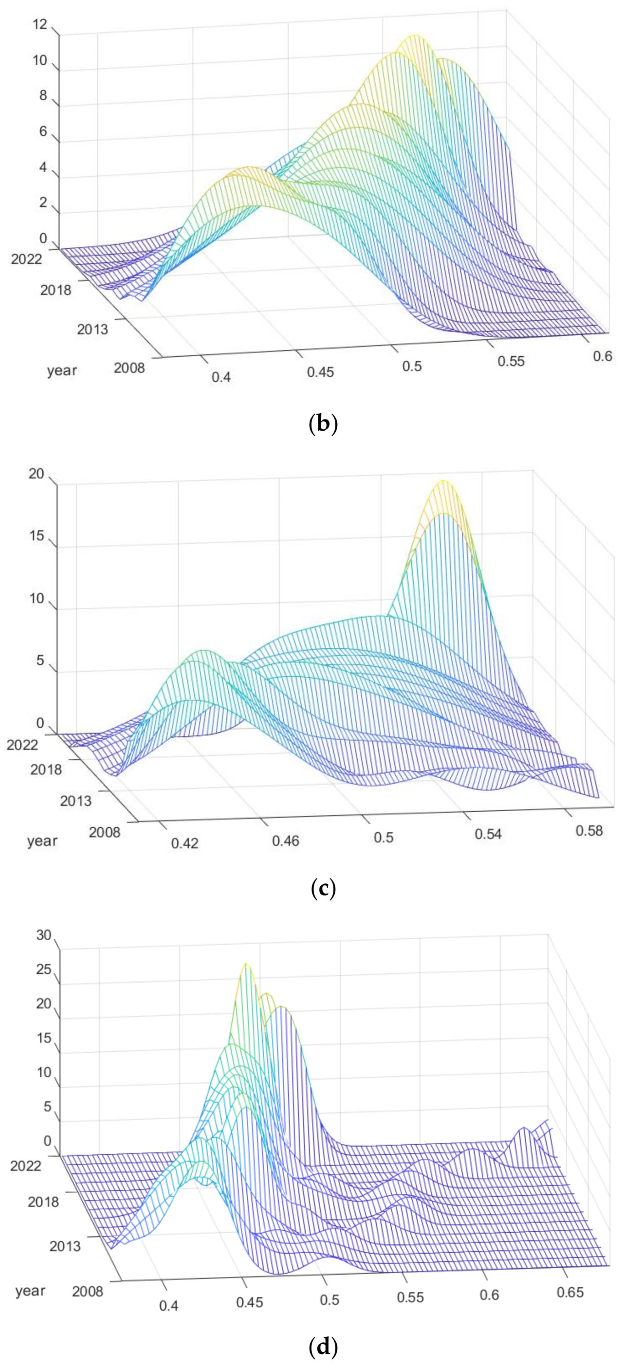 Рисунок 7. ( а ) Оценка плотности ядра динамической эволюции уровней координации взаимосвязи между сельскохозяйственной экономикой и экологией в Китае (2008–2022 гг.). ( б ) Оценка плотности ядра для восточного региона (2008–2022 гг.). ( в ) Оценка плотности ядра для центрального региона (2008–2022 гг.). ( г ) Оценка плотности ядра для западного региона (2008–2022 гг.).
