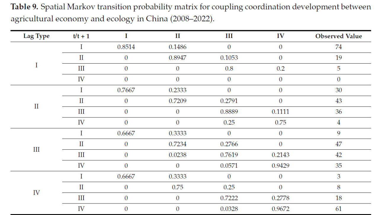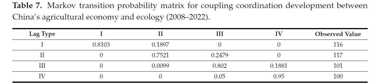 Анализ плотности ядра позволяет получить представление о динамике распределения развития координации между сельскохозяйственной экономикой и экологией Китая, выявляя тенденции в определенные моменты времени. Однако он не может количественно оценить закономерности переходов или предсказать будущую эволюцию. Для решения этой проблемы в исследовании используется модель цепи Маркова, которая анализирует вероятности переходов и динамические изменения между различными уровнями связи.