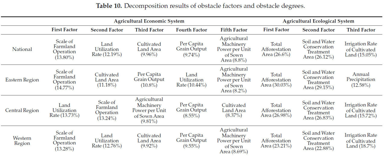 В-четвертых, к основным препятствиям в сельскохозяйственной экономической системе относятся масштабы управления сельскохозяйственными угодьями, коэффициент использования земель, площадь обрабатываемых земель, урожайность зерна на душу населения и механизация на единицу посевной площади, при этом наиболее заметными являются недостаточные масштабы управления сельскохозяйственными угодьями и неэффективное использование земель. В сельскохозяйственной экосистеме ключевыми препятствиями являются общая площадь лесопосадок, площадь, контролируемая эрозией почвы, годовое количество осадков и уровень орошения пахотных земель, а также значительные недостатки в лесопосадках и борьбе с эрозией почвы.