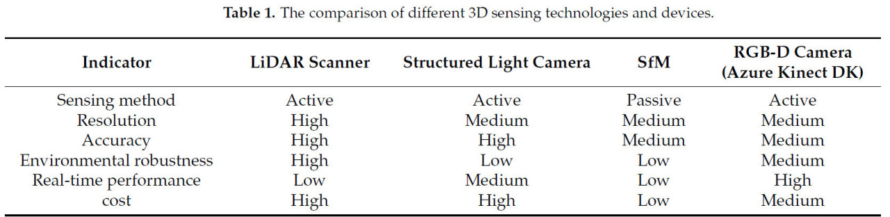 Таблица 1. Сравнение различных технологий и устройств 3D-зондирования.