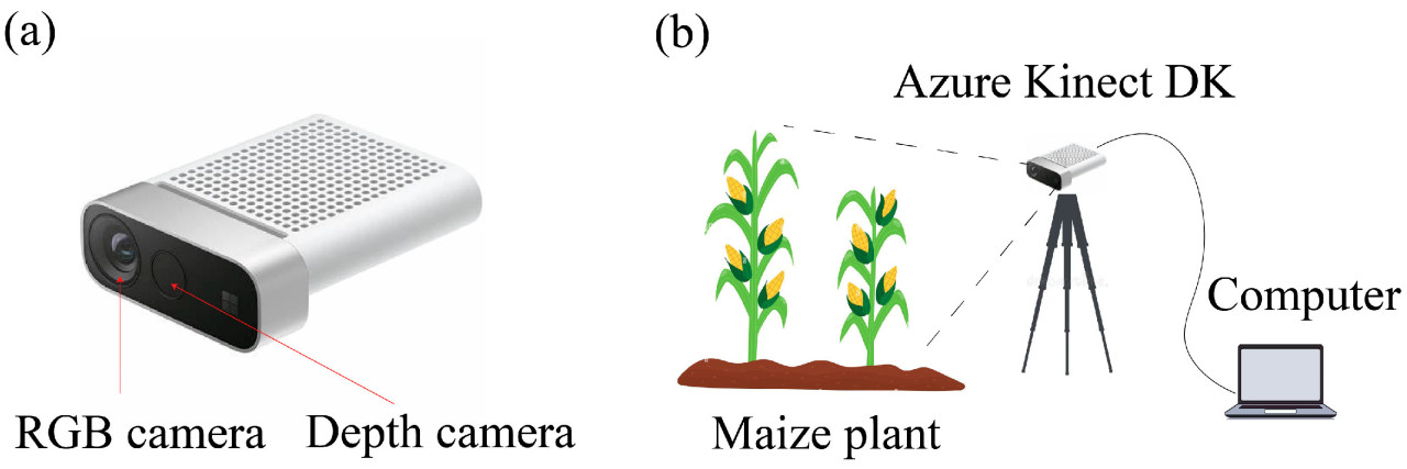 Полевой эксперимент данного исследования проводился на сельскохозяйственном опытном поле Чжэцзянского университета, Ханчжоу, Китай. Данные растений кукурузы были собраны в августе 2024 года, включая RGB-изображения, depth-изображения и истинные значения площадей листьев. Чтобы удовлетворить потребность в высокопроизводительном и быстром фенотипировании в поле, в этом исследовании использовался однокадровый подход с использованием Azure Kinect DK, обеспечивая максимальное экспонирование всей площади листа в пределах поля зрения. В эксперименте RGB-D камера была подключена к мобильной рабочей станции через кабель и установлена на штатив или удерживалась в руках, как показано на Рисунке 1b. Данные собирались и сохранялись программой, разработанной на основе Azure Kinect SDK 1.4.