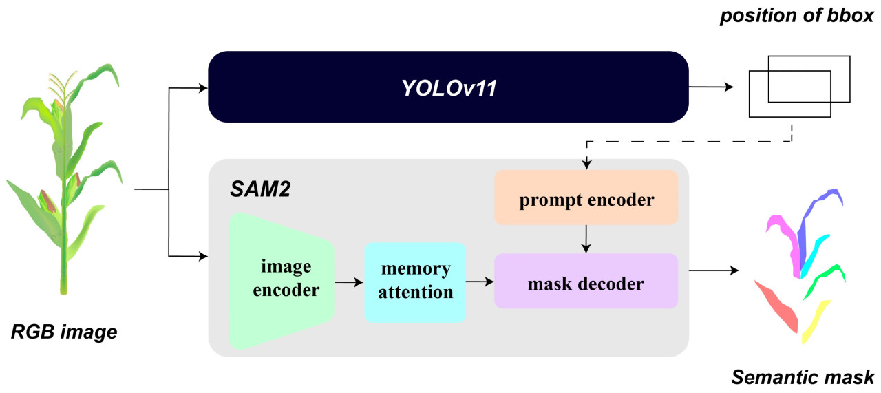 Segment Anything Model 2 (SAM2) — это визуальная LM для интерактивной сегментации изображений, которая возвращает эффективные маски из любой заданной подсказки сегментации [38]. После того как обученная модель YOLOv11 проводила вывод на новых изображениях, положение ограничивающей рамки каждого обнаруженного листа затем передавалось в качестве подсказки в модель SAM2. В итоге, высокоточные маски листьев были получены из модели SAM2. Поскольку точность результатов сегментации должна быть гарантирована, исследование выбрало модель sam2_hiera_large в качестве модели для вывода. Вся структура YOLOv11-SAM2 показана на Рисунке 4.