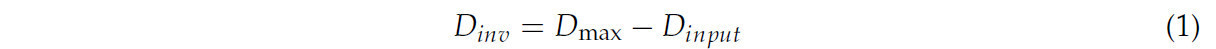 (1) Инверсия глубины. Azure Kinect DK сохраняет depth-изображение в 16-битном формате. Объекты, находящиеся дальше от RGB-D камеры, имели более высокие значения в depth-изображении, но с меньшей достоверностью. Чтобы предотвратить возможность операций дилатации и завершения позволить пикселям с меньшей достоверностью перезаписать пиксели с более высокой достоверностью, depth-изображение сначала подвергается инверсии глубины, при которой объекты, находящиеся ближе к камере, имеют более высокие значения в карте глубины. После инверсии глубины значение depth-изображения было следующим: