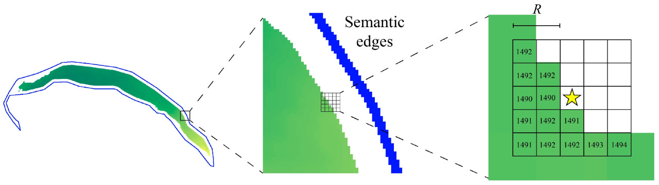 (6) Инверсия глубины. Ядро в форме ромба 5 × 5 использовалось для проведения небольшой дилатации на depth-изображении [39], улучшая взаимосвязь между краями и пикселями с высокой достоверностью в известных областях. Затем depth-изображение снова ограничивалось с использованием семантической маски и подвергалось инверсии глубины, что в итоге давало завершенное depth-изображение. Вся процедура восстановления depth-изображения показана на Рисунке 6.