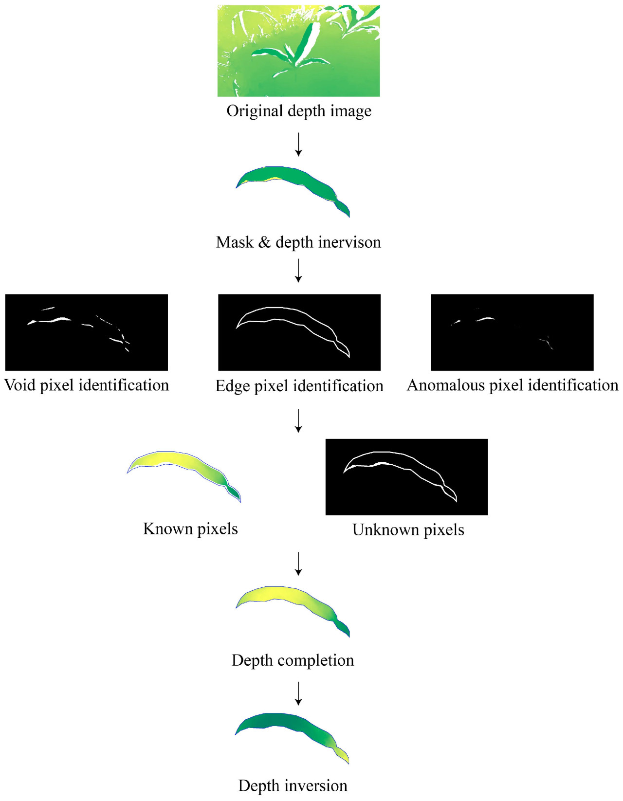 После вывода моделью YOLOv11-SAM2 семантические результаты листьев кукурузы применялись к совмещенному depth-изображению в качестве масок, соответственно. Чтобы идентифицировать и восстановить пустые пиксели и летающие пиксели листовых областей в depth-изображении, это исследование предложило метод восстановления depth-изображения путем интеграции инновационных техник, адаптированных для фенотипирования на уровне органов. Ключевые инновации включают инверсию глубины для приоритизации областей с высокой достоверностью, обнаружение краев на основе топологии для адаптивного восстановления скручивания и складывания листьев, и фильтрацию по гистограмме для динамического устранения аномальных пикселей. Подход фильтрации пикселей алгоритма обеспечивает точное завершение, используя пространственные отношения между известными и неизвестными пикселями, в то время как завершающие этапы улучшения повышают непрерывность краев. Эти усовершенствования значительно улучшают качество depth-изображения, обеспечивая надежные и достоверные измерения даже в сложных морфологических условиях. Более того, как неконтролируемый алгоритм обработки изображений, этот метод предлагает более высокую эффективность и лучшую адаптируемость к различным сценариям, а также устраняет необходимость в обширных данных для обучения по сравнению с методами восстановления на основе глубокого обучения. Предложенный метод был реализован с помощью шести шагов алгоритма, описанных ниже.