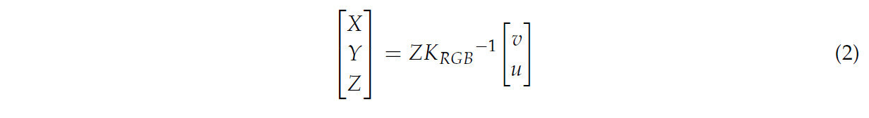 где 𝑋, 𝑌, и 𝑍 — представление пикселей, отображенных в координаты в трехмерном пространстве. 𝑍 — значение глубины пикселя в depth-изображении. 𝑢 и 𝑣 относятся к строке и столбцу пикселя. Аналогично, RGB информация того же пикселя присоединяется к точке (𝑋,𝑌,𝑍).