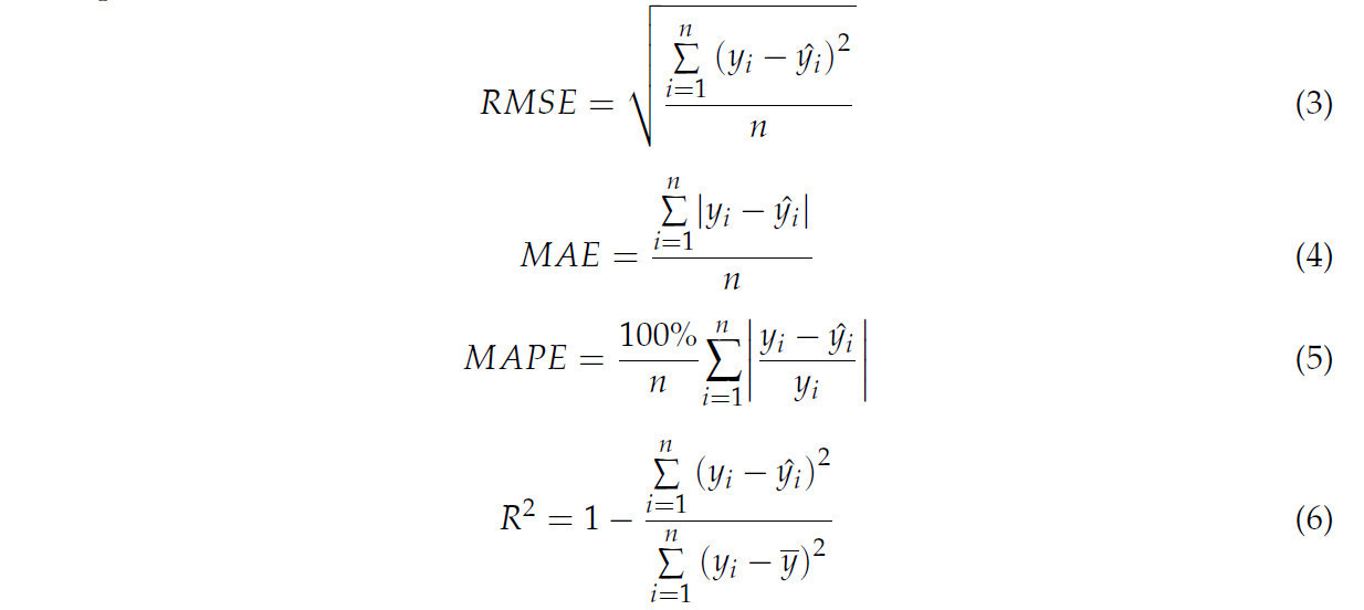 В этом исследовании были приняты четыре показателя для оценки точности измерения площади листа. Среднеквадратичная ошибка (RMSE, Уравнение (3)) отражает общую величину ошибки, в то время как средняя абсолютная ошибка (MAE, Уравнение (4)) представляет среднюю абсолютную ошибку. Средняя абсолютная процентная ошибка (MAPE, Уравнение (5)) выделяет относительную точность в процентах, и коэффициент детерминации (R-квадрат (R2), Уравнение (6)) измеряет, насколько хорошо прогнозы соответствуют фактическим значениям, причем более высокие значения указывают на лучшую производительность.