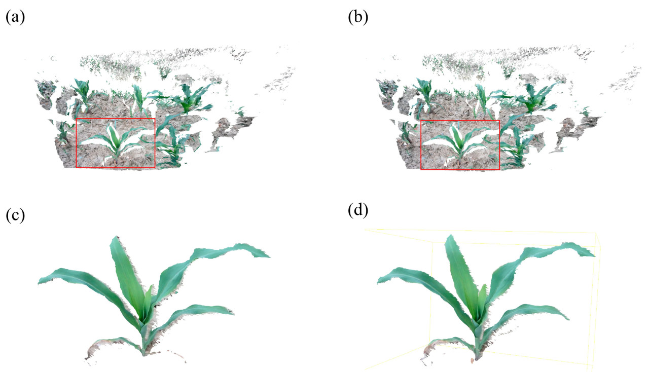 Рисунок 8. Облако точек растения кукурузы. (a) Полное облако точек до повторной калибровки. (b) Полное облако точек после повторной калибровки. (c) Облако точек конкретного растения кукурузы до повторной калибровки. (d) Облако точек конкретного растения кукурузы после повторной калибровки.