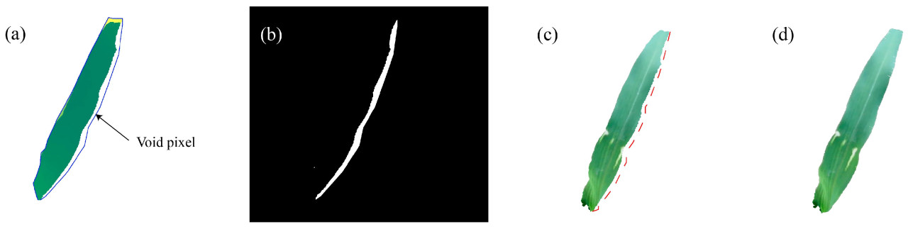 (3) Идентификация краевых пикселей на основе скелета. Чтобы устранить летающие пиксели на краю листа, был принят адаптивный метод идентификации краевых пикселей на основе ширины листа. Из-за возможного скручивания или складывания листьев мы сначала извлекли скелет листа с помощью алгоритма утоньшения Zhang–Suen из маски. Затем средняя ширина листа была рассчитана с использованием кратчайшего евклидова расстояния от каждой точки на скелете до края листа. Пиксели в пределах определенного процента от ширины листа от края листа были идентифицированы как области, подлежащие восстановлению.