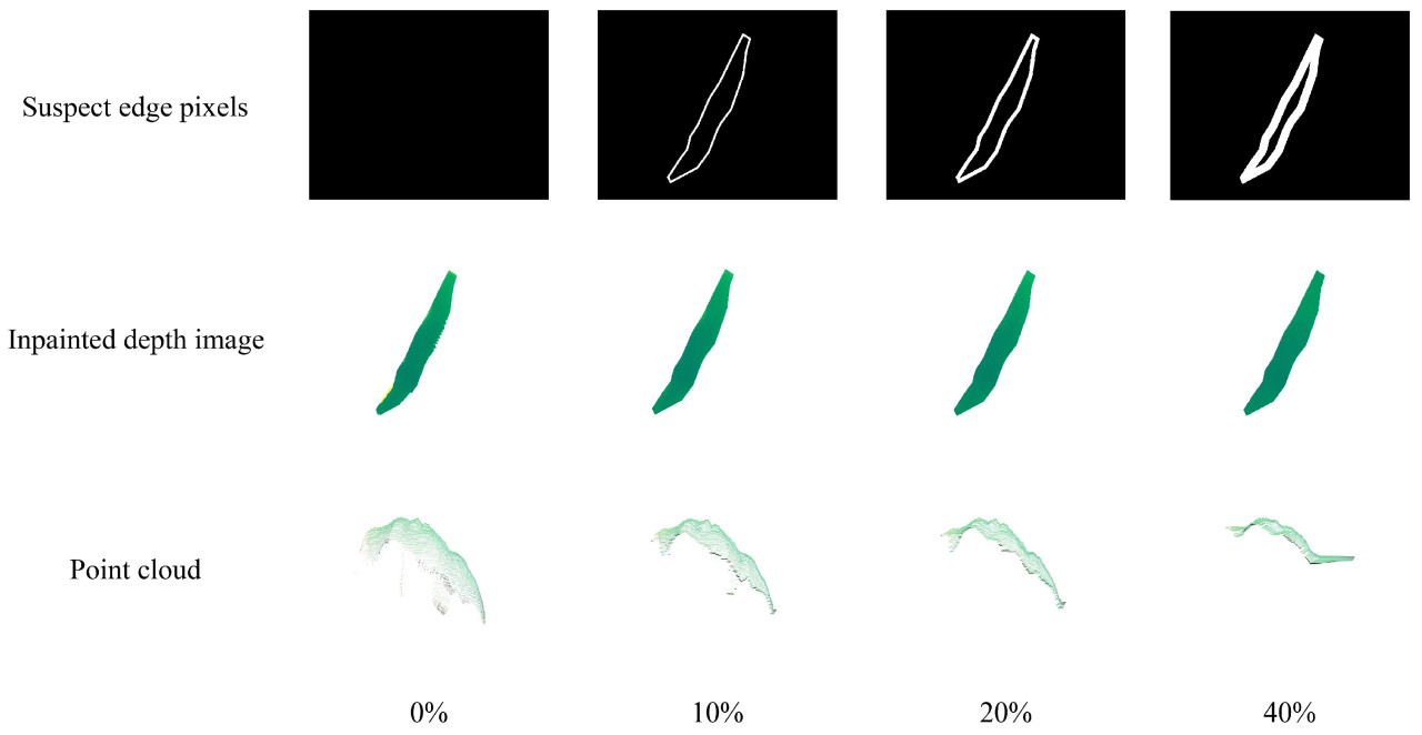 Адаптивная идентификация краевых пикселей на основе ширины скелета листа может эффективно удалять летающие пиксели из исходного depth-изображения. Это исследование проверило производительность идентификации краевых пикселей при различных адаптивных коэффициентах в удалении летающих пикселей. Как показано на Рисунке 11, слишком маленький коэффициент не смог полностью удалить летающие пиксели, в то время как слишком большой коэффициент удалял ключевые действительные известные пиксели из внутренней части листа. Этот недостаток достаточной контекстной информации приводил к большим ошибкам в завершении глубины. Поэтому адаптивный коэффициент в этом исследовании был установлен на 20% ширины скелета листа.