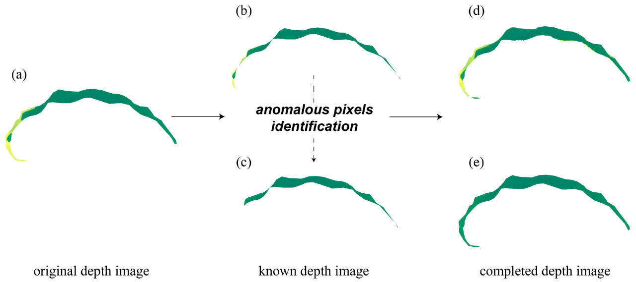 Рисунок 12. Визуализация идентификации аномальных пикселей. (a) Исходное depth-изображение листа. (b) Depth-изображение известных пикселей без идентификации аномальных пикселей. (c) Depth-изображение известных пикселей с идентификацией аномальных пикселей. (d) Depth-изображение после завершения глубины без идентификации аномальных пикселей. (e) Depth-изображение после завершения глубины с идентификацией аномальных пикселей.