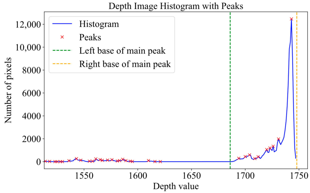 (4) Идентификация аномальных пикселей на основе гистограммы. Хотя вышеупомянутые шаги удалили большинство нежелательных пикселей, некоторые аномальные летающие пиксели все еще оставались необнаруженными. Поэтому мы дополнительно применили фильтрацию по гистограмме, чтобы устранить эти аномальные пиксели. Основной пик в гистограмме depth-изображения с наибольшей выраженностью был идентифицирован, вместе с его левым и правым основаниями. Эти два значения были установлены в качестве верхнего и нижнего порогов для depth-изображения, позволяя идентифицировать аномальные пиксели, значения которых выходят за пределы основного пика.