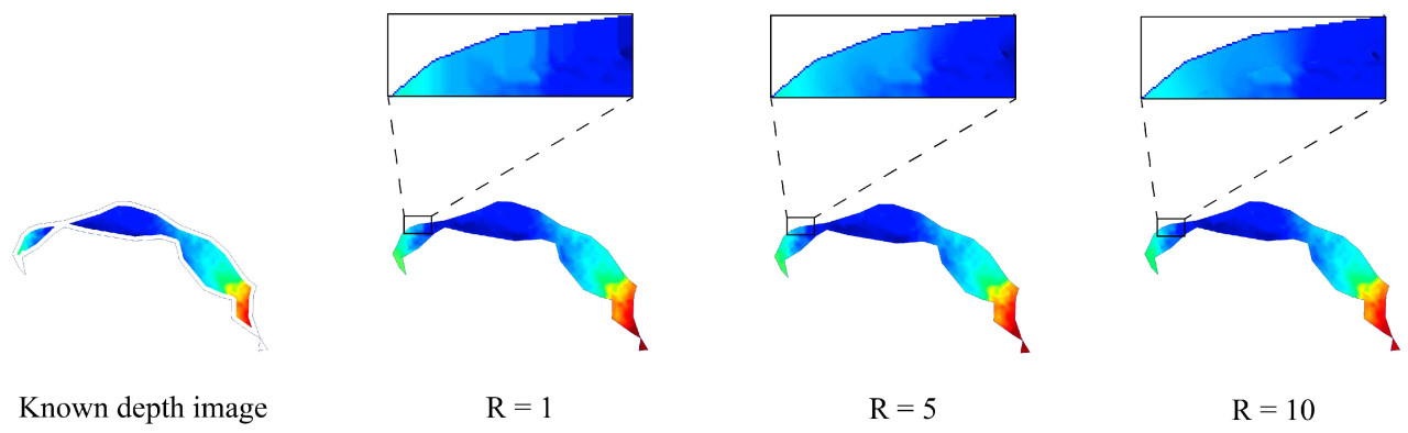 После идентификации всех UPs и KPs, алгоритм фильтра пикселей был применен для завершения глубины. Как показано на Рисунке 14, алгоритм давал относительно гладкие результаты завершения, поскольку он ссылался на средние значения соседних действительных пикселей, тем самым генерируя значения глубины с более высокими уровнями достоверности и сводя к минимуму шум, вносимый летающими пикселями с высоким градиентом на краях. Что касается диапазона поиска R фильтра пикселей, меньший диапазон (например, R = один) ограничивал алгоритм фокусировкой только на соседних локальных пикселях, что приводило к полосатой картине завершения. Напротив, чрезмерно большой диапазон (например, R = 10) генерировал размытые значения глубины, не соответствующие исходному градиенту глубины. В этом исследовании был выбран радиус R = пять, поскольку он достигал равномерной глубины, соответствующей градиентам глубины известных пикселей.
