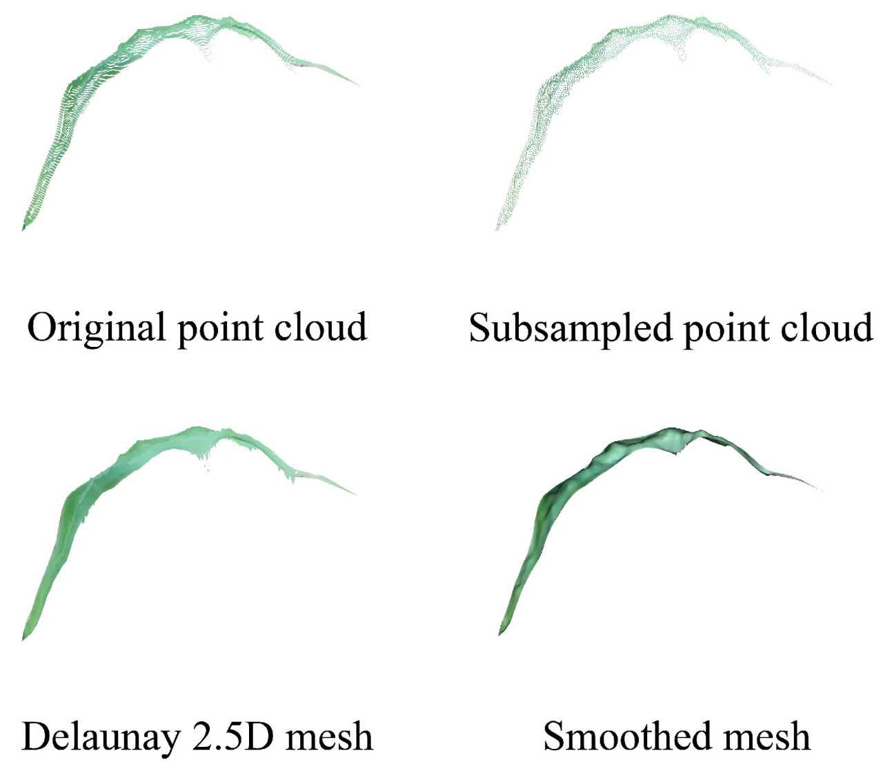 Рисунок 15 иллюстрирует процесс преобразования от исходных RGB-D данных к 3D сетчатой модели, пригодной для измерения площади листа. Из-за ограничения разрешения по направлению глубины depth камеры, исходное облако точек показывало ярко выраженное ступенчатое распределение. После пространственной подвыборки эта проблема была смягчена, хотя и за счет некоторой плотности облака точек. После триангуляции Delaunay появились заметные колебания по сетке, заставляя листовую модель казаться чрезмерно широкой и толстой. Однако окончательная сглаженная сетка эффективно представляла как форму, так и цветовые характеристики листа.