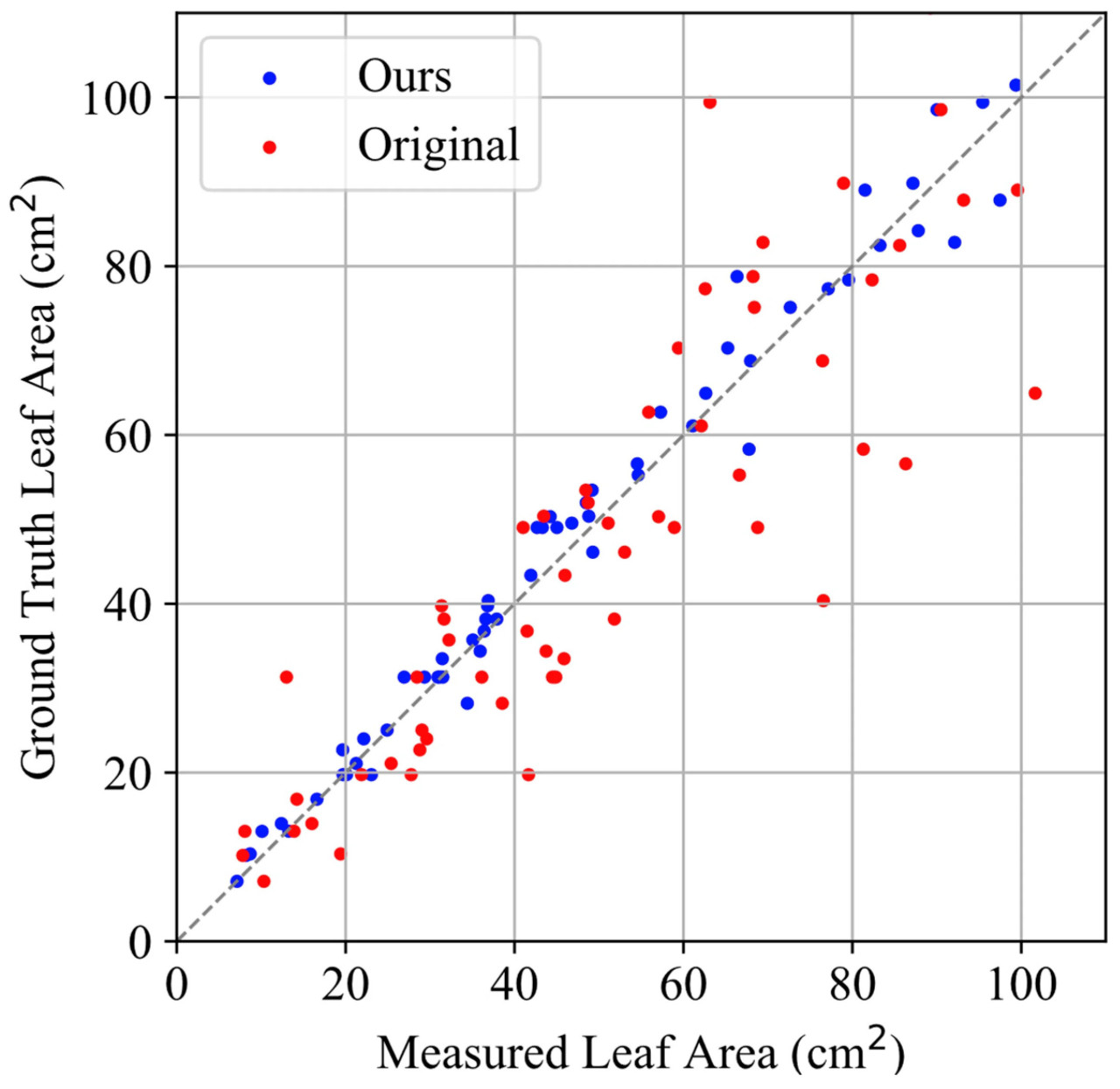 Из Таблицы 2 очевидно, что среди 60 образцов листьев исходные данные были значительно подвержены влиянию ранее упомянутых факторов, что привело к большим ошибкам измерений. Напротив, предложенный метод измерения площади листа на основе восстановления глубины достиг RMSE 4.114 см² и MAE 2.980 см², в то время как MAPE снизился с 25.384% до 6.549%. В то же время, надежность метода также была подтверждена значением R2, равным 0.976. Этот метод поддерживал уровень производительности в полевых условиях, сопоставимый с измерениями, проведенными в стабильных лабораторных условиях, как продемонстрировано в нескольких исследованиях [23]. Рисунок 16 конкретно иллюстрирует взаимосвязь между измеренной площадью листа и истинным значением для каждого образца, на основе нашего метода (красные точки) и исходных данных (зеленые точки). В пределах площади листа от 10 см² до 100 см², зеленые точки были в основном разбросаны вокруг обеих сторон линии 𝑦=𝑥, с ошибками, в основном возникающими из-за переоценки, вызванной летающими пикселями, и недооценки из-за потери площадей листа от пустых или аномальных пикселей глубины. Напротив, красные точки были тесно сгруппированы вокруг линии 𝑦=𝑥, указывая на то, что метод эффективно смягчил ошибки, представленные в исходных данных.