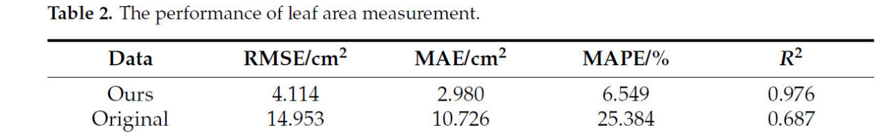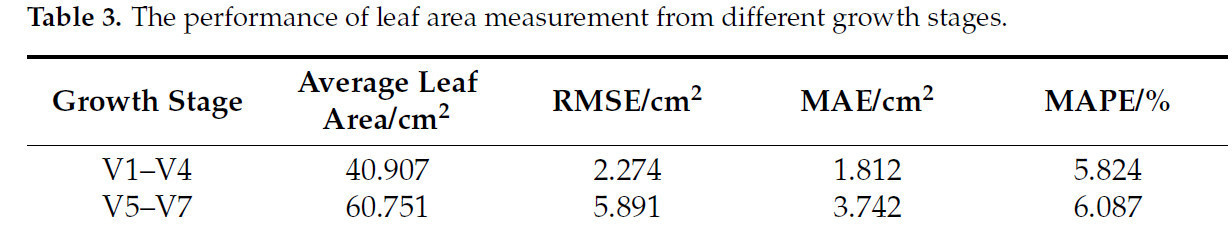 В то же время, это исследование проверило производительность предложенного метода в измерении площади листа на различных стадиях роста растений кукурузы. Собранные образцы со стадий роста V1–V7 были разделены на ранние образцы (V1–V4) и поздние образцы (V5–V7). Ранние образцы включали 25 образцов листьев, в то время как поздние образцы включали 35 образцов листьев. Результаты измерений показаны в Таблице 3.