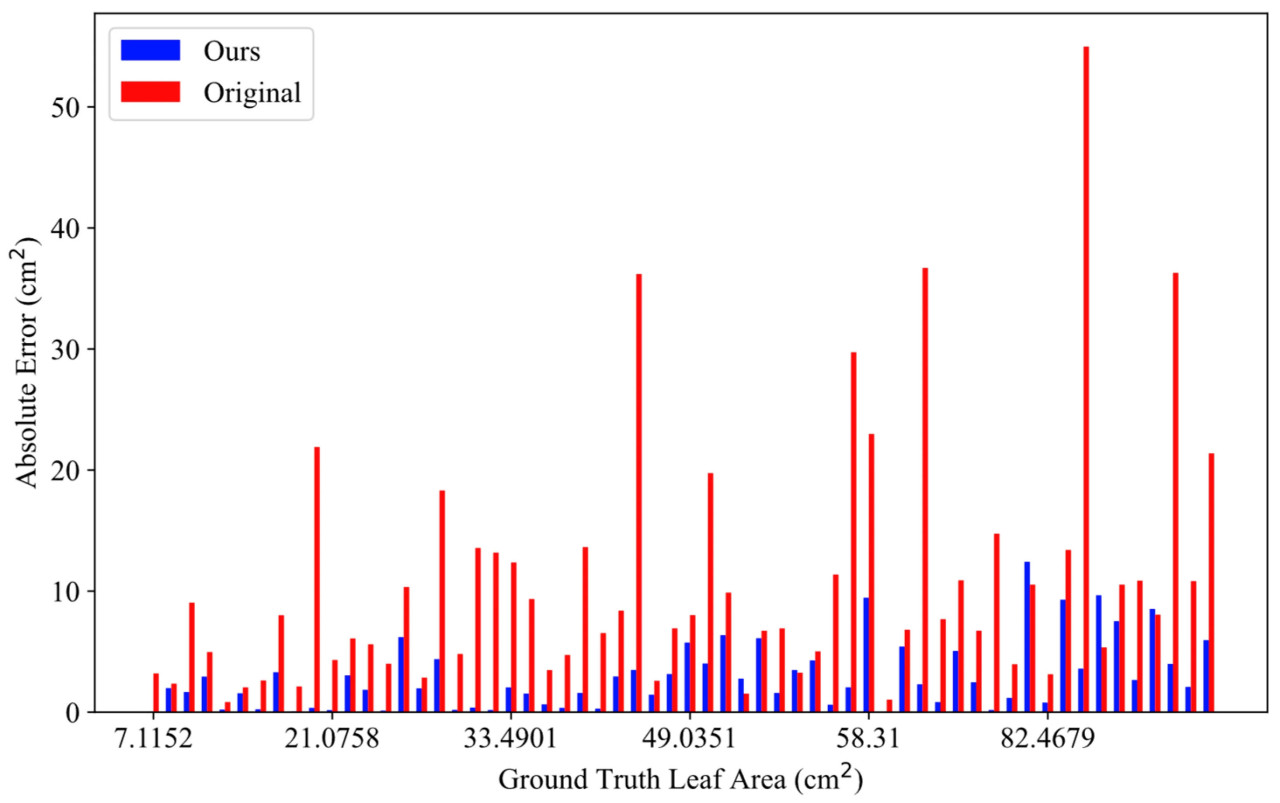 Как обсуждалось ранее, большие измерительные поверхности вносят больше шума из-за присущих ограничений точности RGB-D камеры, способствуя систематическим ошибкам. Дополнительно, большие края листьев более склонны к скручиванию по мере роста растений кукурузы, и RGB-D камера с трудом точно захватывает такие сложные локальные структуры, что приводит к значительным ошибкам, вызванным неполной или неточной глубинной информацией.