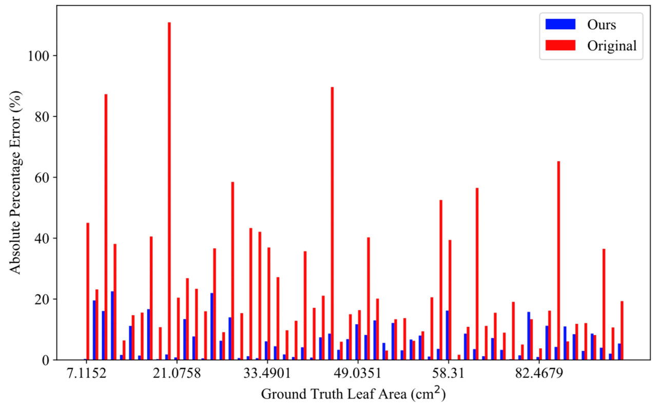 Чтобы учесть различия в размерах, была использована абсолютная процентная ошибка (APE) для нормализации AE. Как показано на Рисунке 18, более крупные листья демонстрировали относительно меньшие APEs, тогда как меньшие листья имели более высокие APEs. Это расхождение возникает в основном потому, что меньшие области труднее точно воспринимать RGB-D камере, что приводит к внесению летающих пикселей. Хотя метод восстановления глубины смягчил некоторые из этих проблем, он не мог полностью удалить летающие пиксели, не ставя под угрозу действительную глубинную информацию, тем самым увеличивая относительные ошибки для меньших листьев.